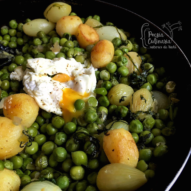 Ha sido un plato sencillo, con muchos sabores y como dice Pedro Subijana, me ha hecho decir -¡que rico y bueno que esta!. Este es un plato vegetariano, donde los guisantes combinados con las cebollitas tiernas, las hojas de lechuga y menta le dan un gran sabor y la textura de las patatas que he sellado un poco entre ghee como adición personal de textura, junto a los huevos escalfados me han llevado al cielo. Lo recomiendo y ahora sí les dejo esta versión...