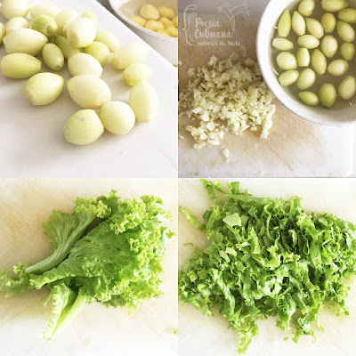4. En una sartén poner 2 cucharadas de aceite de oliva y una de ghee (si quieren solo aceite). Adicionar la cebolla picada, saltear un poco, luego de un par de minutos adicionar las cebollitas y dejar dorar un poco (en mi caso cerré la sartén por un par de minutos). Luego adicionar la lechuga y saltear bien, salpimentar y adicionar un poco de azúcar solo espolvorear. Agregar un poco de caldo de vegetales (en mi caso de la cocción de los guisantes) y cocinar por 5 minutos.