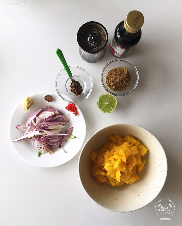 Del chutney debo decir que tuve entre ojos el que Marga tiene de Cebolla morada. Ahora, debo aclarar que este chutney tiene adiciones personales que hice, un poco revisando la receta del de cebollas. Utilicé cebolla morada en lugar de blanca (me parece que deja un lindo contraste de sabor y color con el amarillo del mango). También, puse mostaza antigua (para poner ese punto de mostaza que creo le va muy bien). Lleva los limones que acá en Brasil y Colombia son los limones de siempre y que para el resto de lugares denominan lima. He puesto azúcar mascabado porque me gusta sentir el punto dulzón bien contrastado a la hora de combinarlo con carnes como el cerdo (me perdonarás Marga por tantas adiciones, ha sido una combinación de ese par de chutneys con un punto dulce que para mi gusto lo requería).